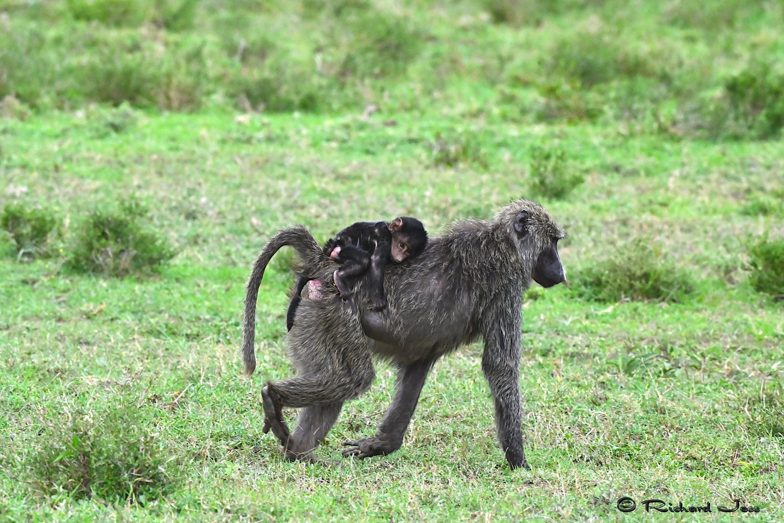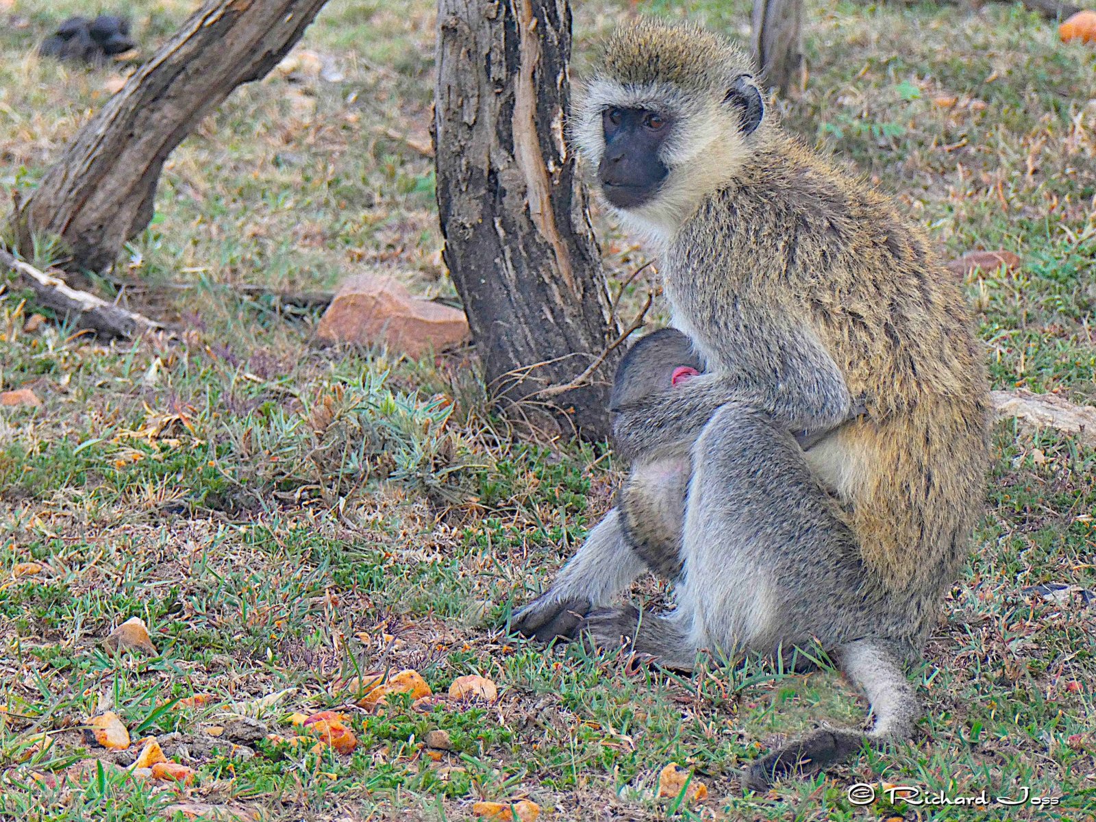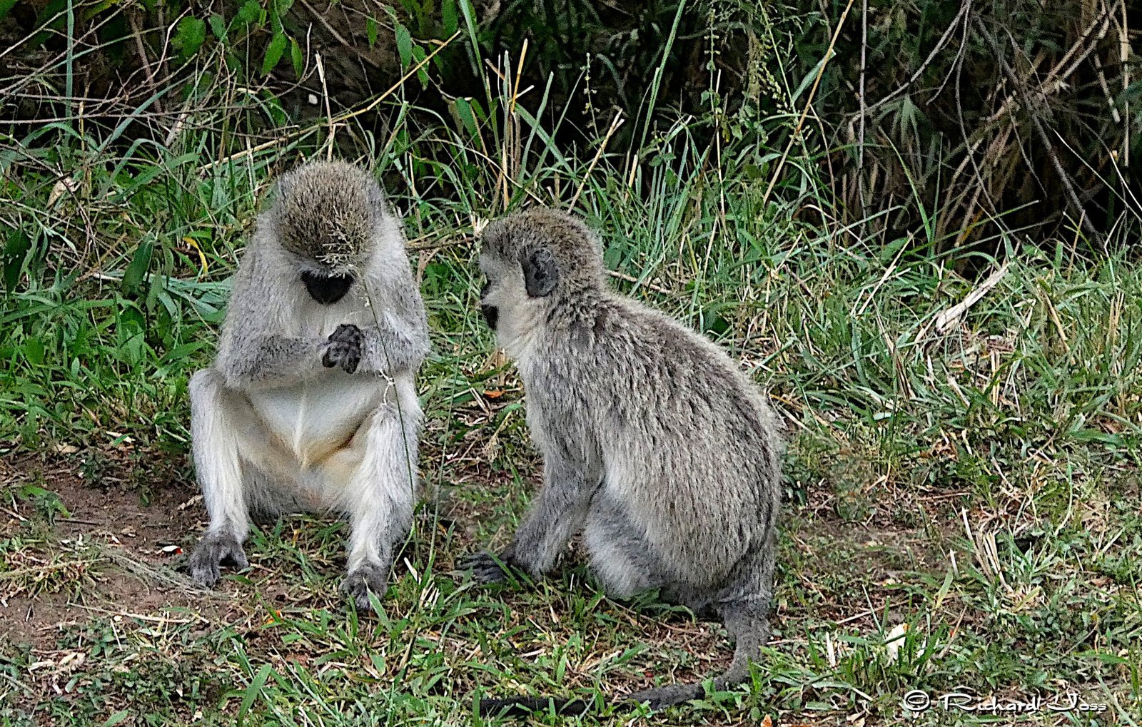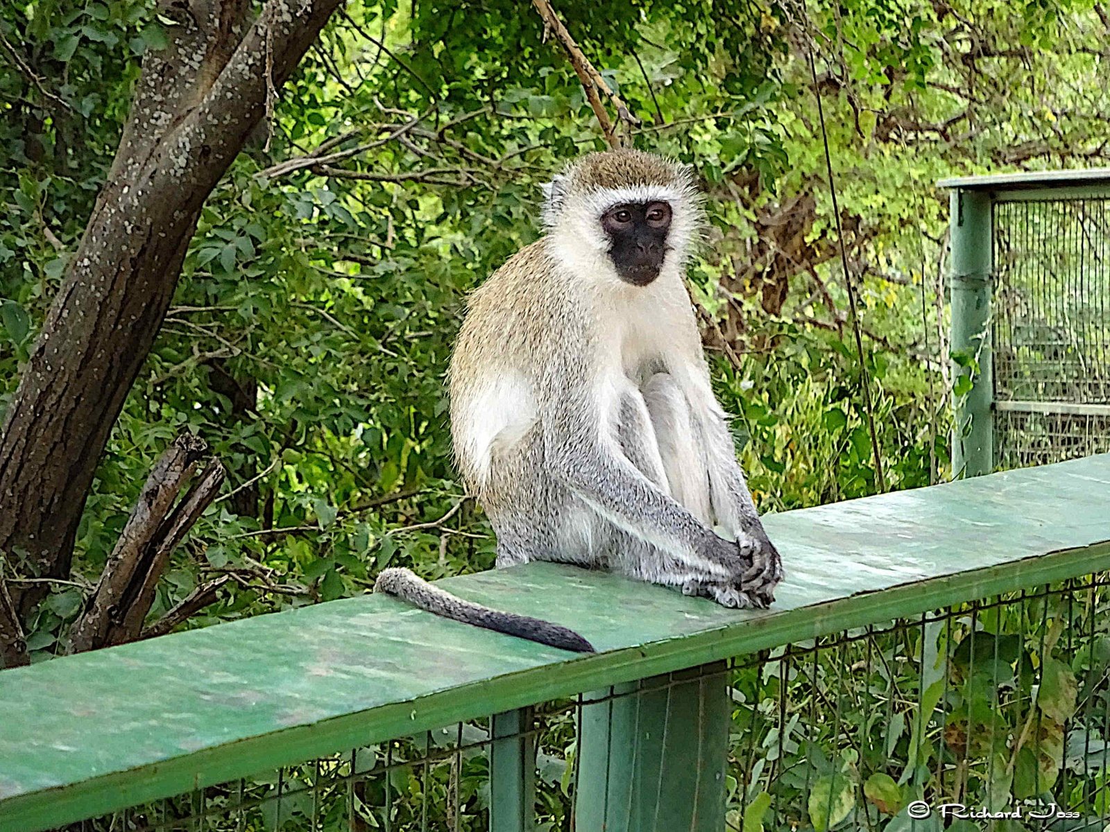 Another monkey we saw frequently on safari was the vervet. The vervet is a small, black-faced monkey, common in East Africa. There are several subspecies of vervet monkeys, but, generally, the body is a greenish-olive or silvery-grey. The face, ears, hands, feet, and the tip of the tail are black, but a conspicuous white band on the forehead blends in with the short whiskers. The arms and legs are approximately equal lengths, enabling it to walk with ease on all fours while on the ground, and this actually makes it quite speedy when running.