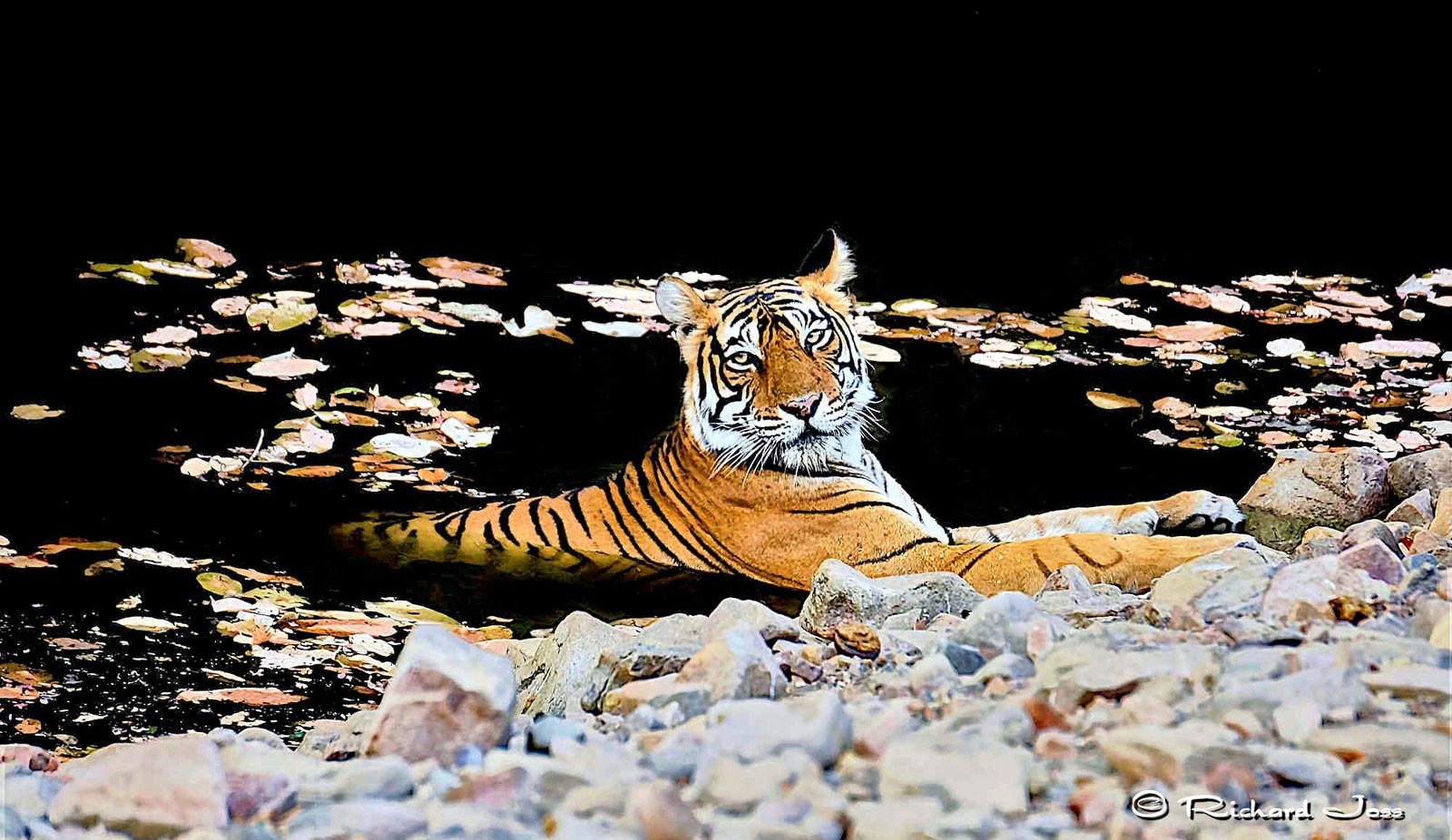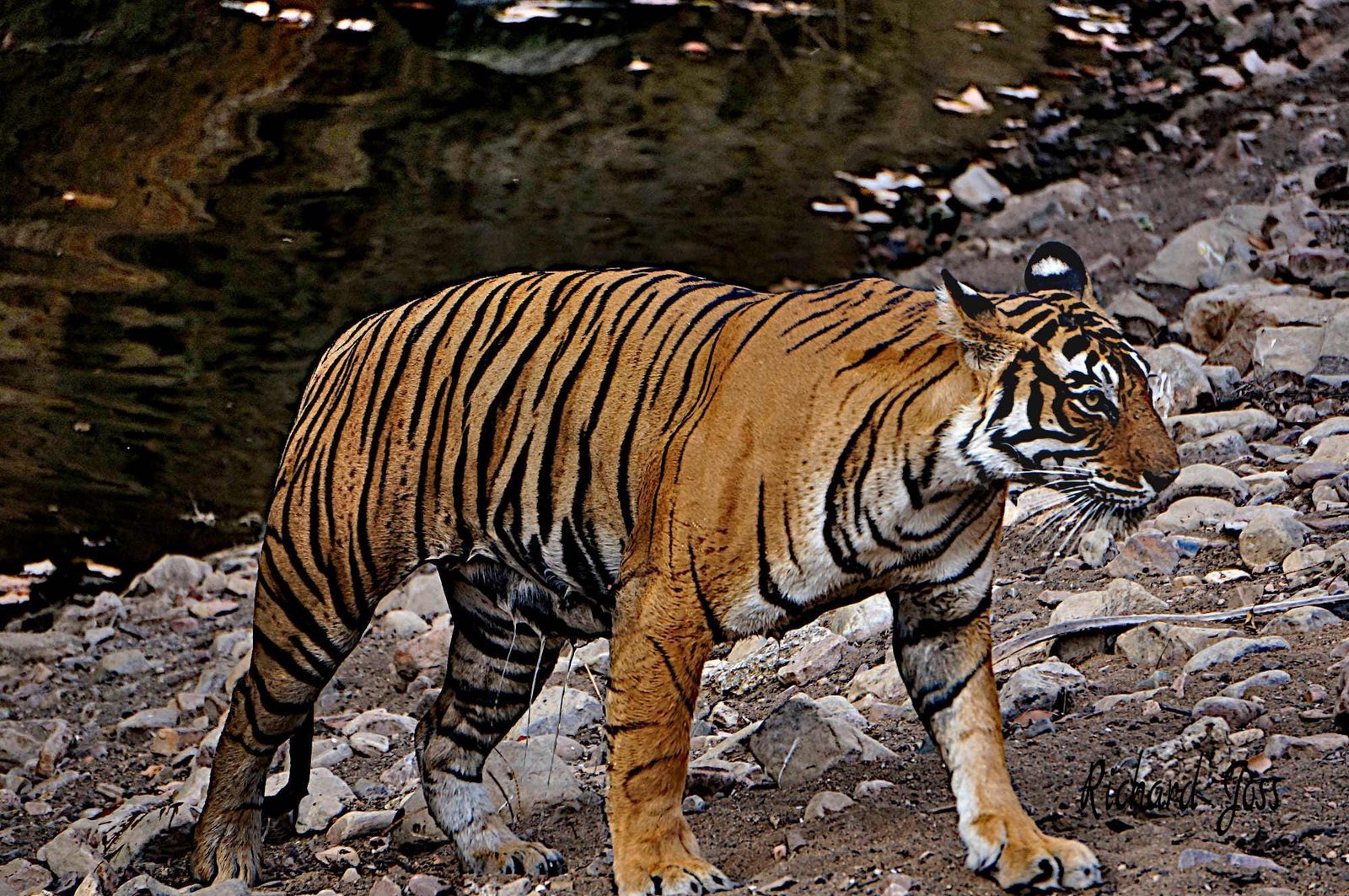 We found this beautiful female through the skill, experience and perseverance of our driver/guide. Almost as soon as we set off on our drive, we could hear distant alarm calls of Sambar deer (one of the tigers’ favourite prey). Then our driver picked up recent tiger prints crossing a sandy road. We followed the tracks, spotting them several times only to lose them again as we crisscrossed the area. Finally, after nearly an hour of tracking, we came round a corner to see her cooling off in a small pond right next to the road.